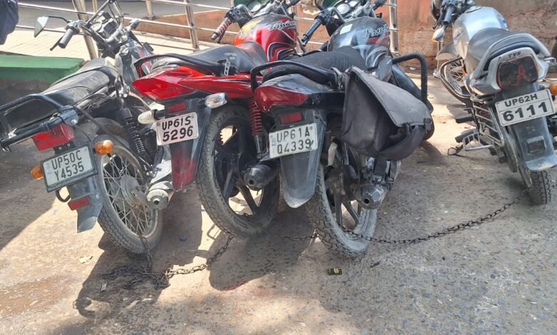 जमानिया रेलवे स्टेशन के मुख्य द्वार के सामने अनाधिकृत रूप से खड़ी दोपहिया वाहनों के खिलाफ रेलवे सुरक्षा बल ने मंगलवार को सख्त कार्रवाई की। आरपीएफ के जवान अरुण कुमार सिंह ने स्टेशन परिसर के बाहर खड़ी नौ बाइकों को जंजीर से बांध दिया और सभी पर जुर्माना लगाया।