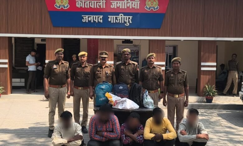 गाजीपुर। थाना जमानियां कोतवाली पुलिस ने आगामी होली पर्व से पहले क्षेत्र में नशा तस्करों पर शिकंजा कसते हुए 96 टेट्रा पैक 8 PM अंग्रेजी नजायज शराब (कुल 17.28 लीटर) के साथ पांच अभियुक्तों को गिरफ्तार किया। मुखबिर की सूचना पर 25 फरवरी को थाना क्षेत्र के हेतिमपुर नहर पुलिया के पास से पहलाज कुमार (20) निवासी गोविंदपुर थाना बिंद जनपद नालंदा बिहार, को 20 टेट्रा पैक, करजही रेलवे स्टेशन से राजेश बिन्द (22) निवासी गोविंदपुर थाना बिंद जिला नालंदा बिहार, को 18 टेट्रा पैक, बडेसर नहर पुलिया से रवीश कुमार (45) निवासी दिलावलपुर थाना बिहटा जनपद पटना बिहार और सन्तोष बिन्द निवासी मोकर थाना करौना जिला जहानाबाद बिहार को 39 टेट्रा पैक और गाय घाट मोड़ से दीपक बिन्द को 19 टेट्रा पैक के साथ गिरफ्तार किया गया।