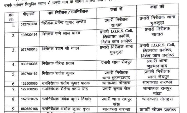 उपनिरीक्षकों में संतोष कुमार पाठक को नोनहरा से करण्डा, शैलेन्द्र प्रताप सिंह को चुनाव सेल से रामपुर मांझा, विवेक कुमार तिवारी को रामपुर मांझा से नोनहरा तथा अशोक कुमार गुप्ता को करण्डा से प्रॉपर्टी सीजर प्रकोष्ठ भेजा गया है।