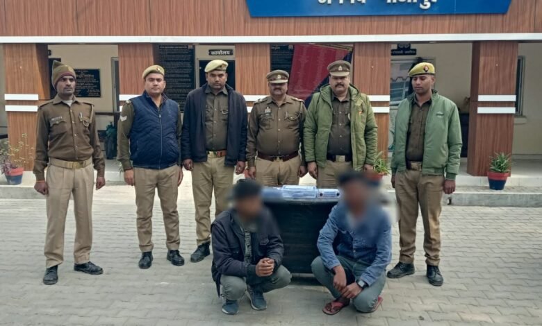 उप निरीक्षक अश्वनी प्रताप सिंह मय हमराह चेकिंग में मामूर थे। इसी दौरान मुखबिर खास से मिली सूचना के आधार पर डिग्री उर्फ इलायचीपुर से वांछित अभियुक्त भुपेन्द्र बिन्द (25) पुत्र रामप्यारे बिन्द निवासी डेढ़गावा थाना धीना जनपद चंदौली तथा रिषभ पाल (19) पुत्र श्री रामनरेश पाल निवासी देवपुरा थाना काल्पी जनपद जालौन को दबोच लिया गया। तलाशी के दौरान अभियुक्तों के कब्जे से दो मोबाइल फोन, एक तमंचा .315 बोर तथा एक जिन्दा कारतूस .315 बोर बरामद किया गया। पुलिस ने मौके से बरामद असलहा व सामान को कब्जे में लेकर अभियुक्तों के विरुद्ध विधिक कार्यवाही शुरू कर दी है।